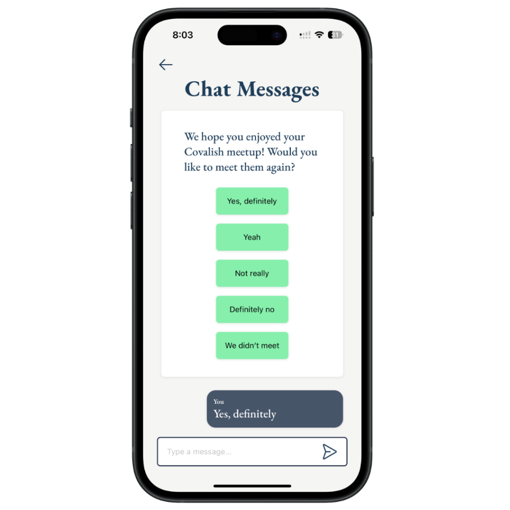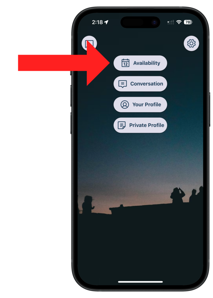 Eventually Covalish will integrate with your calendar to detect potential openings in your schedule when you might be available to meet someone new. For now we’re scheduling meet-ups for 8:30am and 6:30pm. Click “Availability” on the app’s home screen to let us know what days of the week you’re generally available at any of those times.